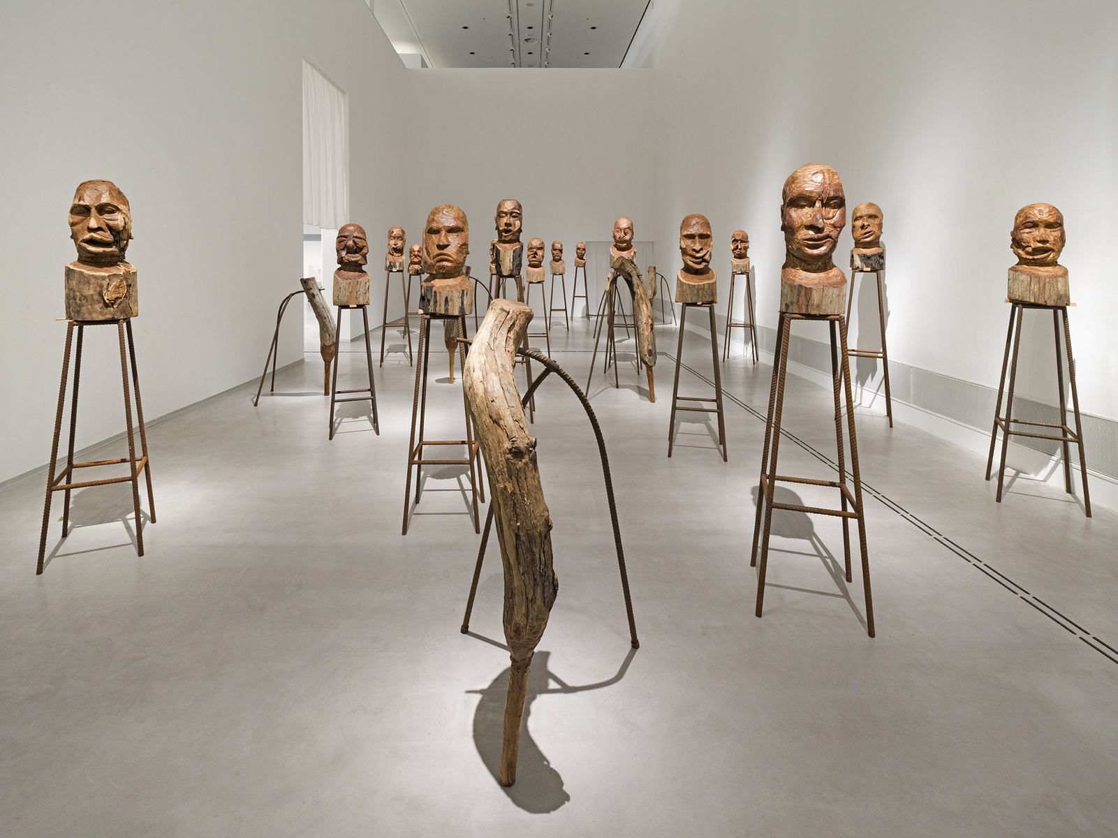 Installation; wooden busts on metallic plinths, wooden sculptures on metallic supports, single-channel video projection, colour, sound